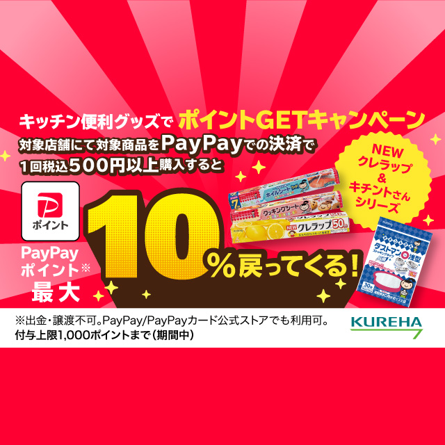 対象店舗にて対象商品を税込500円以上購入しPayPayで支払うと最大10%のPayPayポイントが戻ってきます。